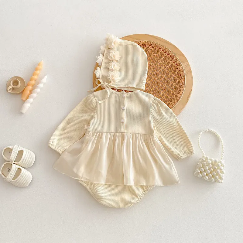 Wholesale Kids Baby’S Girls Fashion Solid Color Flower Long-Sleeve Rompers Hat Two-Piece Set