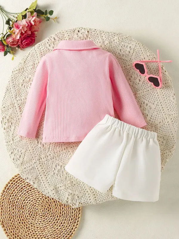 Wholesale Kids Girls’ Fashion Solid Color Lapel Long Sleeve Top Pleated Flower Shorts 2-Piece Set