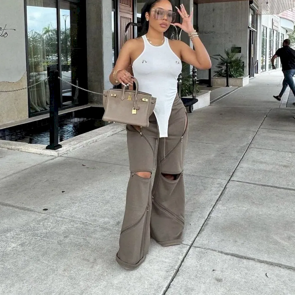 Women Fashion Sexy Stitching Multi-Zipper Hollow-Out Loose Straight Flare Pants