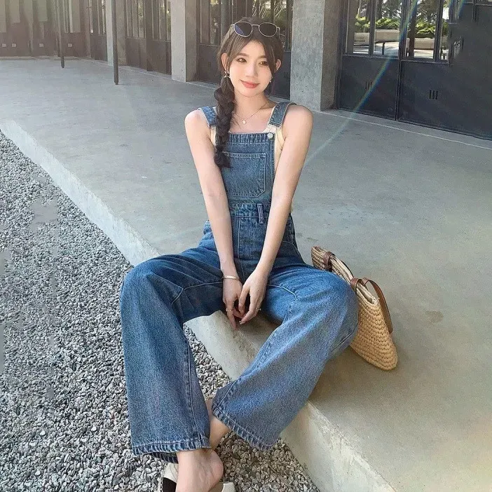 Women Fashion Casual Retro Ripped Loose Wide Leg Denim Jumpsuits