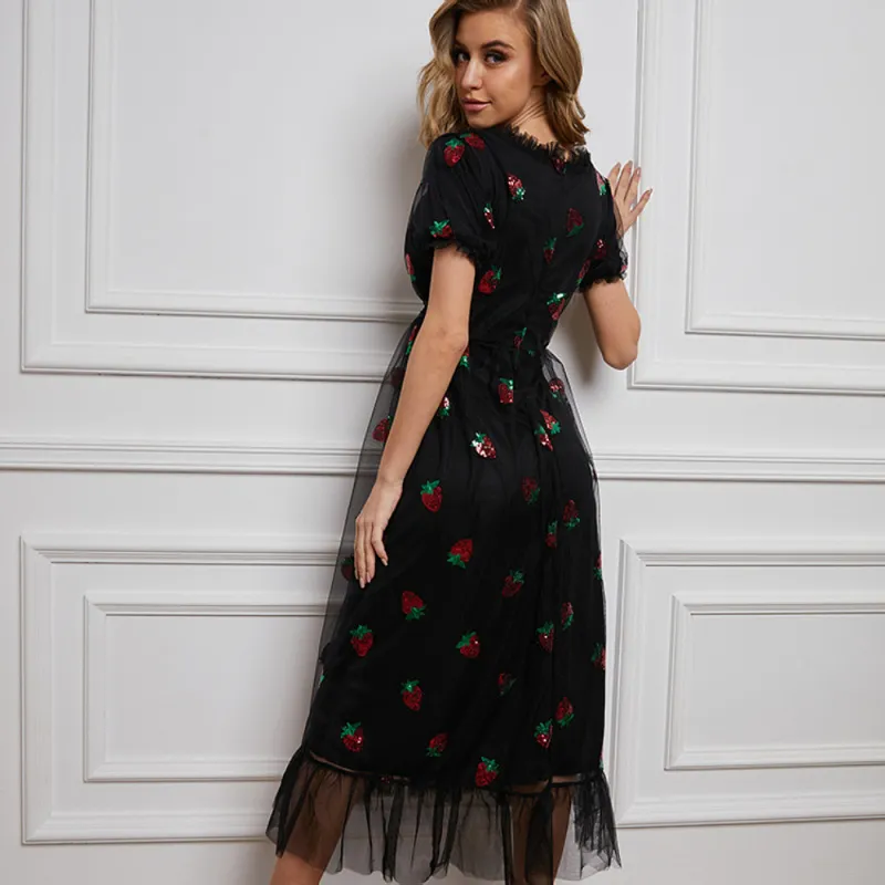 Plus Size Women Sweet Dating Short Puff Sleeve V Neck Mesh Patchwork Ruffled Dress
