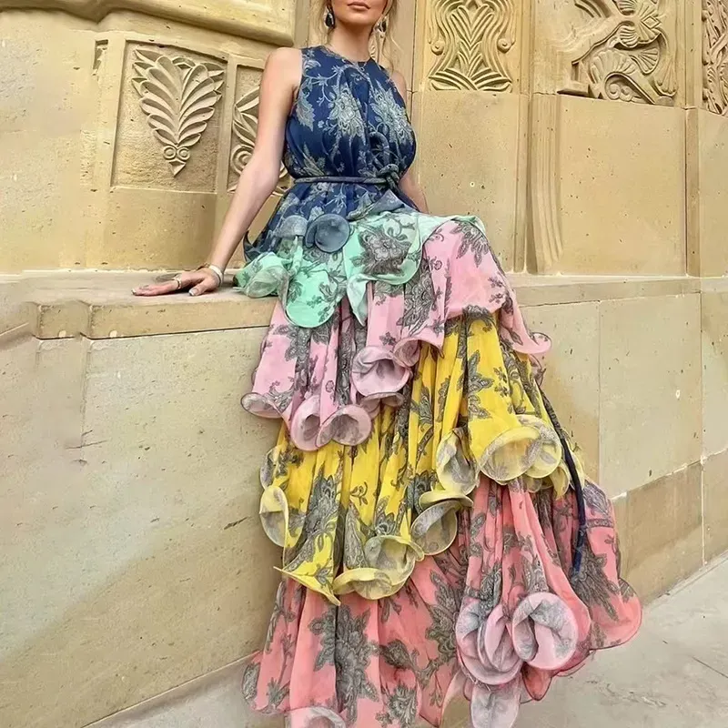 Women Fashion Elegant Printed Round Neck Sleeveless Ruffled Dress
