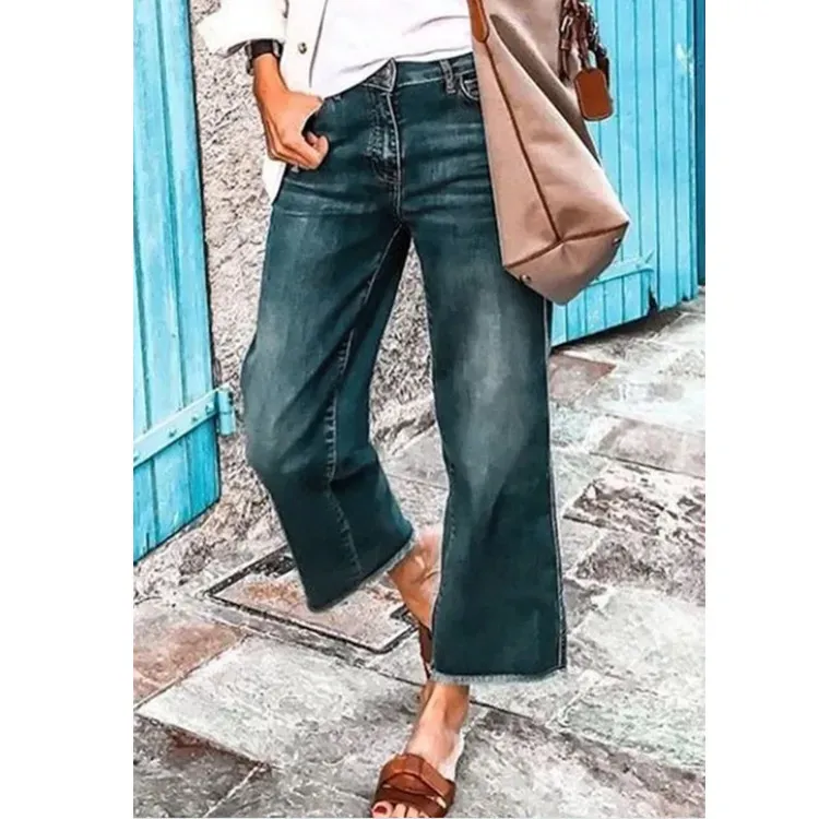 Women Casual Ripped High-Waist Straight Raw Hem Jeans