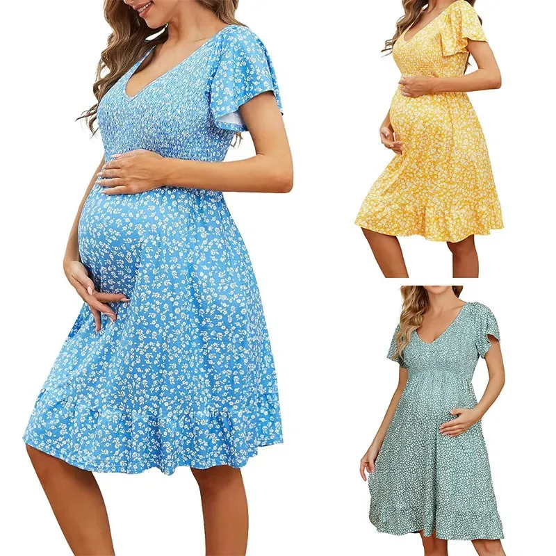 Summer Pregnant Women Fashion V-Neck Small Tiny Flower Printed Nursing Dress