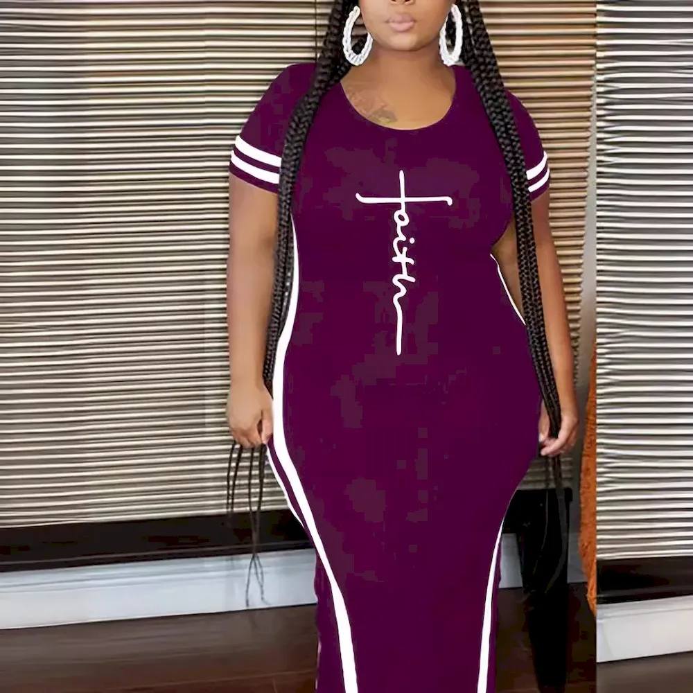 Women Fashion Casual Printed Split Short Sleeve Round Neck Plus Size Dress