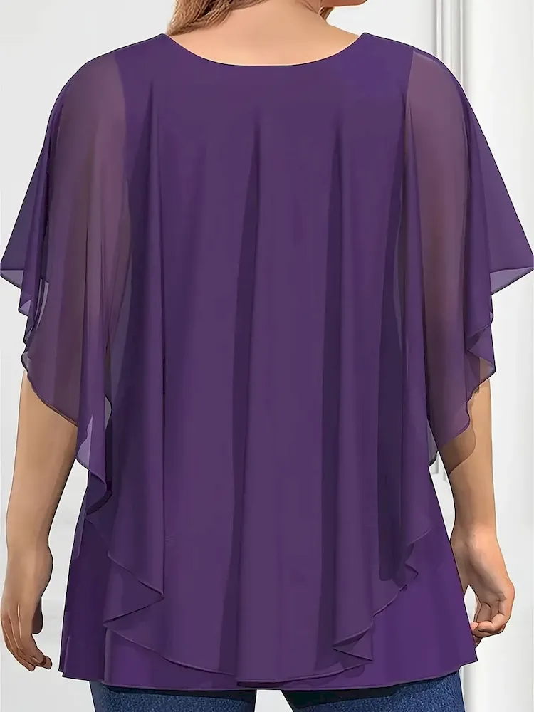 Women Fashion Casual Solid Color Plus Size Pleated Short Sleeve Loose T-Shirt