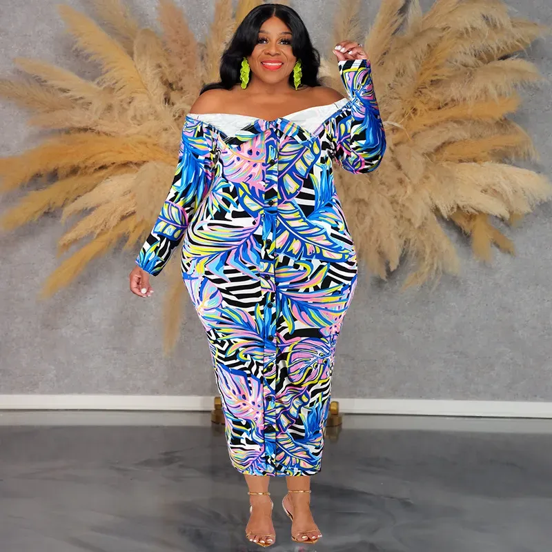 Women Fashion Sexy Plus Size Printed Off Shoulder Long Sleeve Slim Fit Dress
