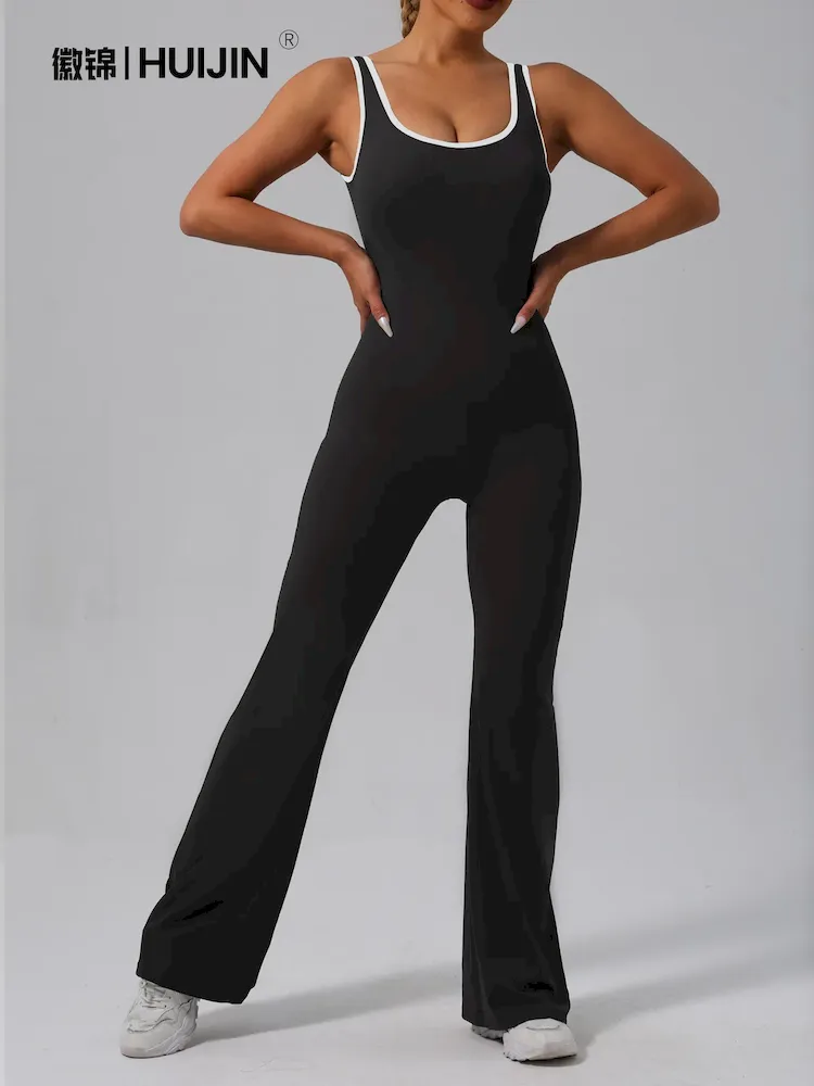 Contrast Color Yoga Backless Running Exercise Fitness Flare Jumpsuits