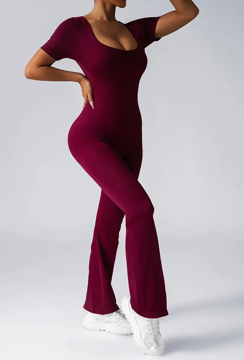 Women Fashion Casual Solid Color Square Neck Short-Sleeve Backless Yoga Sports Jumpsuits