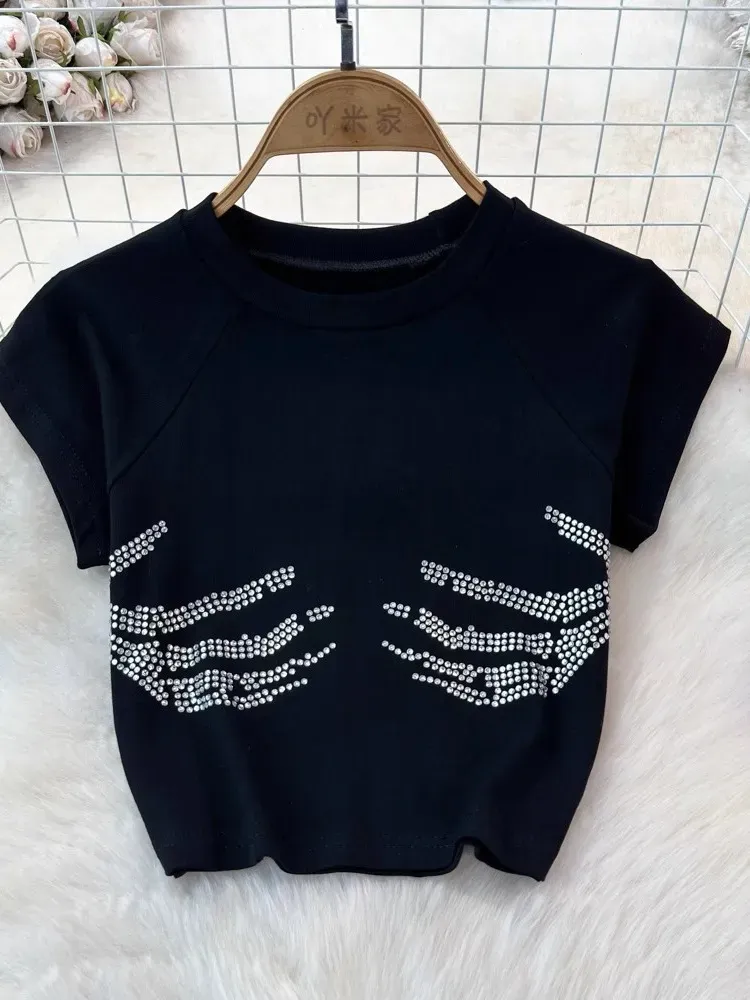 Women Fashion Sexy Magic Claw Rhinestone Printed Short-Sleeve T-Shirt