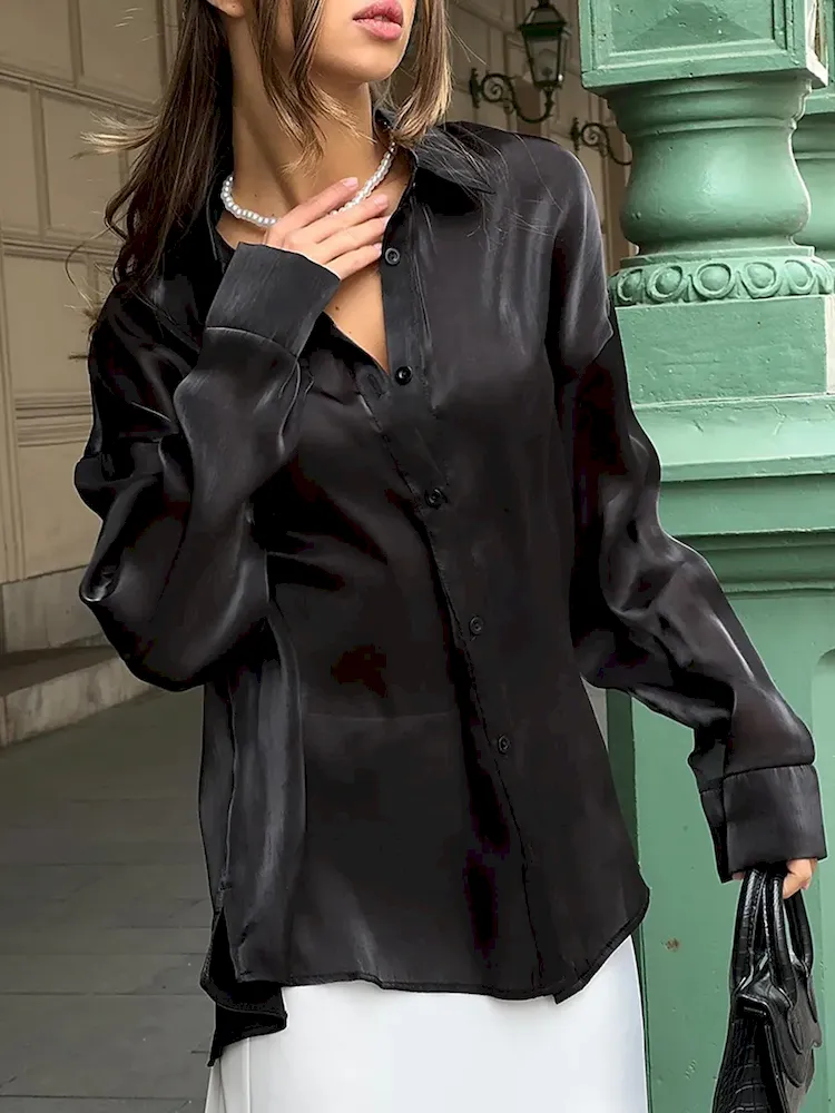 Women Fashion Casual Solid Color Lapel Long Sleeve Shirt