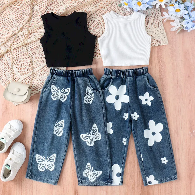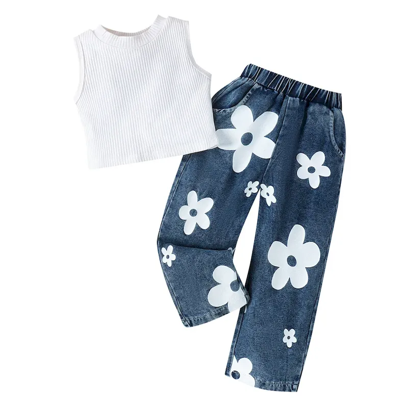 Wholesale Kids Girl’S Fashion Sweet Fresh Printed Pleated Camisole Loose Pants Two-Piece Set