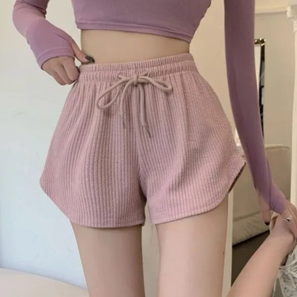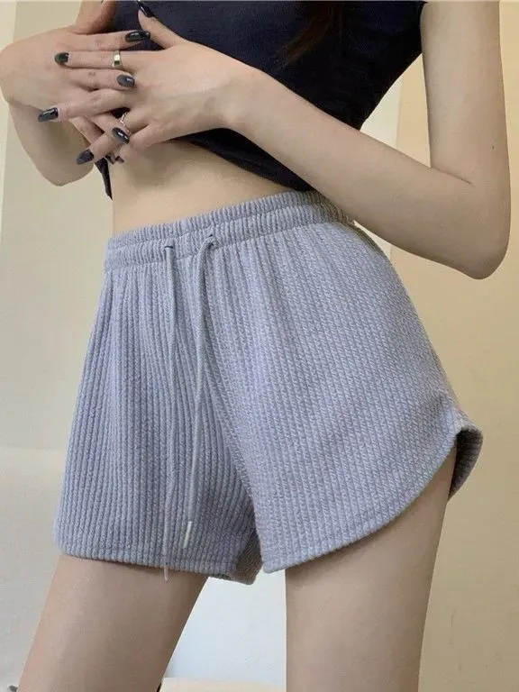 Women Fashion Casual Solid Color Waffle High Waist Loose Shorts