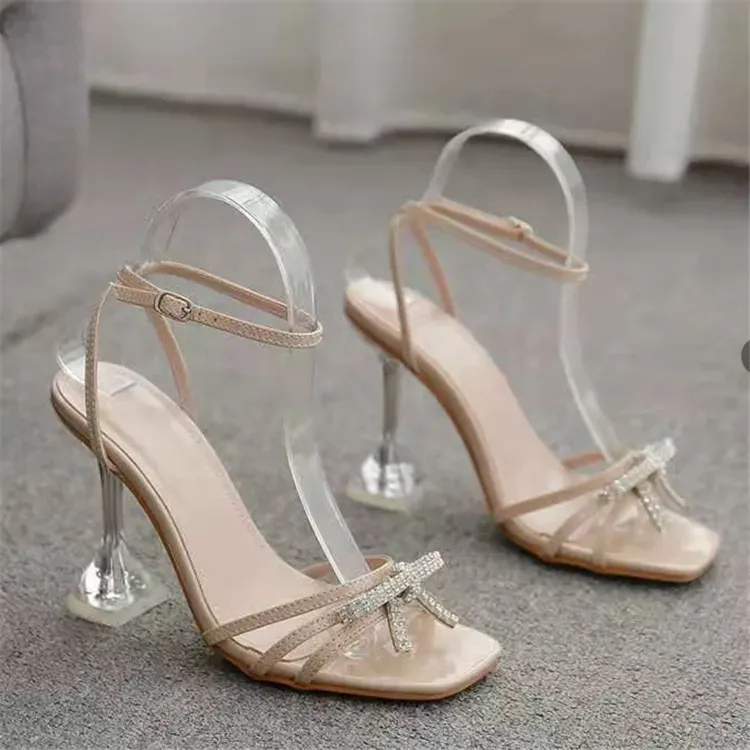 Women Fashion Sexy Rhinestone Bowknot Square Toe High Heel Shoes