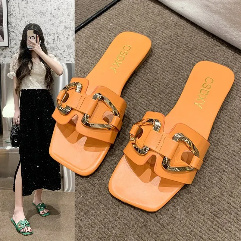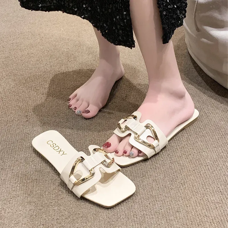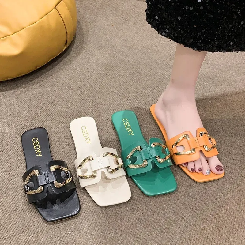 Women Fashion Solid Color Metal Double Buckle Square-Toe Flat Slippers – Premium Fashion Apparel for Modern Life